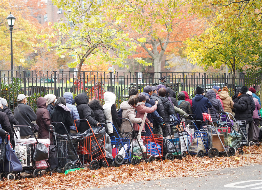 美國紐約一處食物發放點人們在領取食物 美政府“停擺”三周聯邦雇員排隊領食品救濟